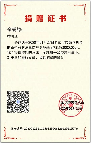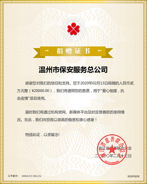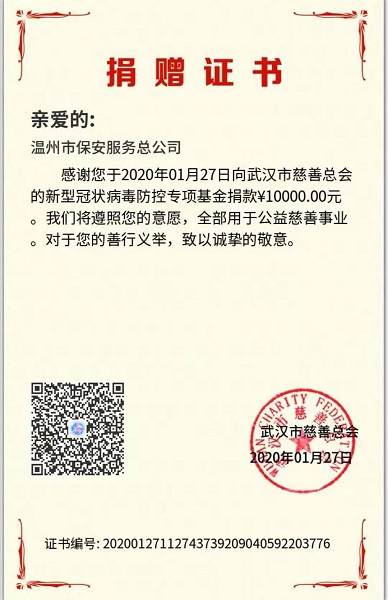 同时,此次抗疫期间,温州保总向武汉市慈善总会捐款10000元整,林川江总经理以个人名义向武汉市慈善总会捐款3000元整。林川江总经理表示,疫情无情,人间有爱,温州保总将始终坚持把为人民服务放在第一位,视社会责任为己任,坚持公益行为,积极行动、踊跃捐赠,为防控新冠肺炎疫情贡献一份心力;用实际行动回馈社会,贡献一份属于温暖的力量。