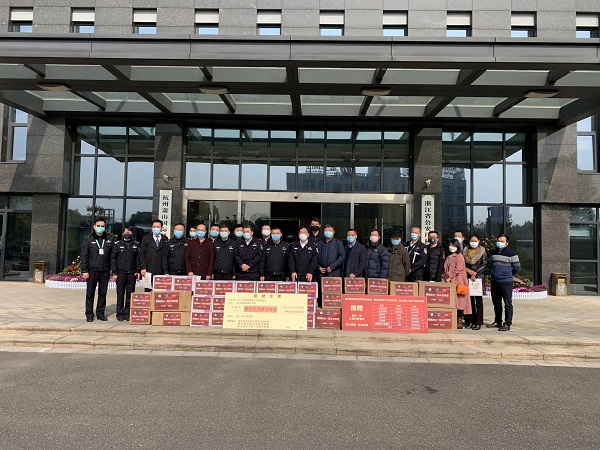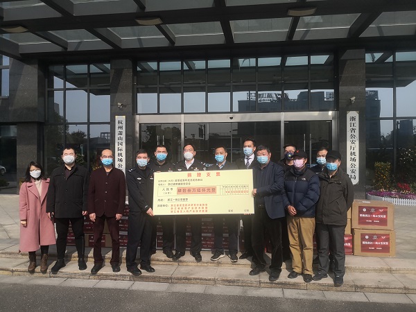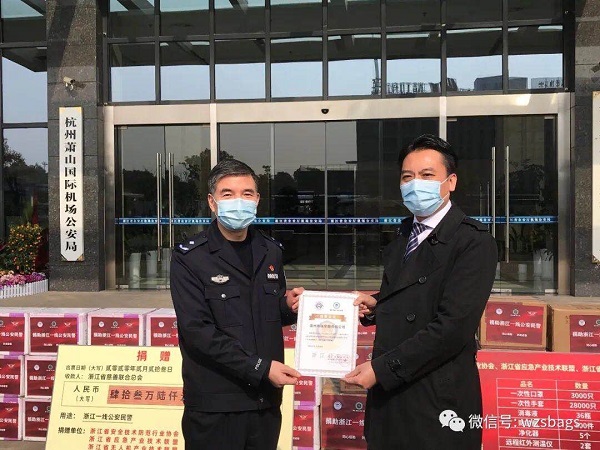 2月23日上午,“同心相助 抗击疫情”浙江安防行业新冠肺炎疫情防控捐赠仪式在浙江省公安厅机场公安局举行。浙江省公安厅政治部副主任陆子宝,科技信息化局局长杨磊,机场公安局局长单守疆、政委高晓明,浙江省警察协会副主席兼秘书长鲍浩东,浙江省安全技术防范行业协会秘书长赵永华,副秘书长吴云龙、王玉辛、方良、陆东辉,浙江省应急产业技术联盟专家委执行主任吴志洪,浙江省无人机产业技术联盟副秘书长马艺洋,以及部分捐赠企业代表出席了活动。温州市保安服务总公司林川江总经理作为公司代表出席此次捐赠仪式。