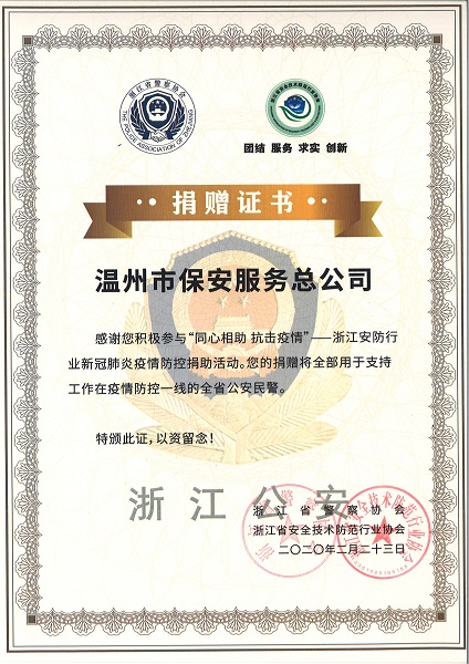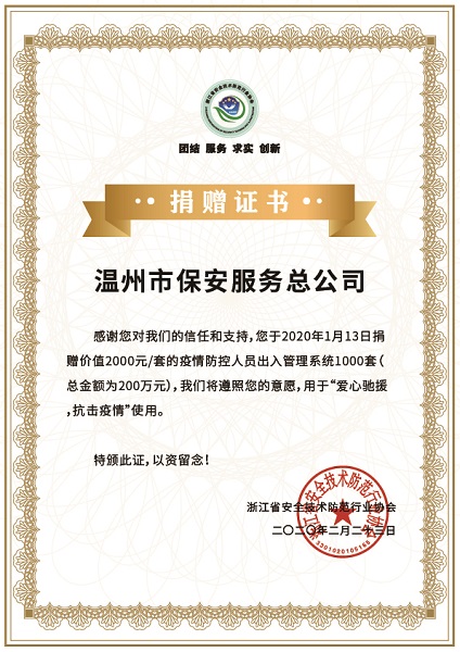 “同心相助 抗击疫情”浙江安防行业新冠肺炎疫情防控捐赠活动是由浙江省安全技术防范行协会、浙江省应急产业技术联盟和浙江省无人机产业技术联盟联合发起的定向捐赠全省一线公安民警活动。温州保总积极响应,于2月13日第一时间捐赠价值2000元/套的“疫情防控人员出入管理系统”1000套(总金额为200万元)及现金捐款20000元整,用于此次“同心相助 抗击疫情”项目。温州保总将继续发挥行业优势,尽全力为我省公安工作贡献力量。