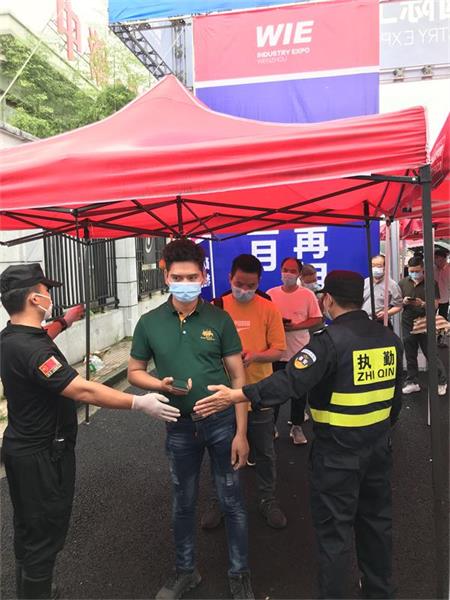 疫情未绝,我们不退 目前国内新型冠状肺炎疫情发展取得阶段性成效,但疫情防控工作仍不能有丝毫松懈。展会期间,温州市保安服务总公司全体保安队员克服高温天,人流量大等困难,佩戴口罩,坚持每日测量体温,并全力做好展会现场疫情防控。要求参展人员凭证入内,并严格要求佩戴口罩,人员,车辆逐一检查健康码,紧盯红外线体温监测仪,全天十几个小时无一人喊累,无一刻松懈,严格按照客户单位及上级领导要求执行,把疫情防控工作做到最好。