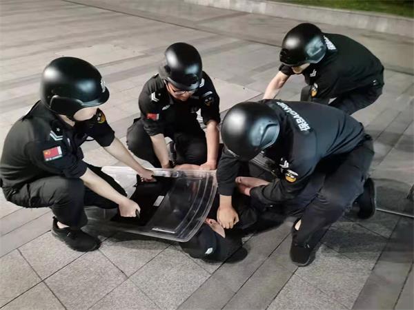 同时开展演练的还有温州保总驻浙江省安防学院保安队。“进攻、进攻,侧翼两名队员注意跟进!”。只见前边二人手持盾牌,另外二人分持齐眉棍、脚叉排列左右,四人配合默契,一拱一拱的朝着“歹徒”突进。保安队长在一旁观察本次演练,演练结束后,队长就演练中出现的问题进行了详细讲解,重点讲解了各反恐防暴装备的作用及使用注意事项,并结合实际遇到各类暴恐事件时的应对方式进行逐一讲解。