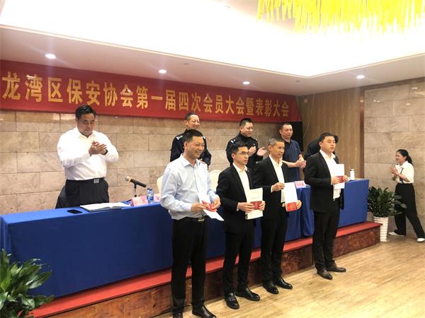 4月27日下午,龙湾区保安协会在温州瑶溪王朝大酒店召开第一届四次会员大会暨表彰大会。温州市公安局龙湾区分局海防大队大队长蒋磊、海防大队副大队长梁毅、协会有关领导,各会长、副会长单位、全体会员单位、获奖单位及优秀保安员代表参加本次会议。会上,温州市龙湾区保安协会授予温州保总“抗疫先进单位”荣誉称;浙江省公安厅授予温州保总队员潘进波“全省抗击疫情表现突出个人”荣誉称号;温州市龙湾区保安协会分别授予温州保总队员史海伟、王富平、徐峰“优秀保安员”荣誉称号。