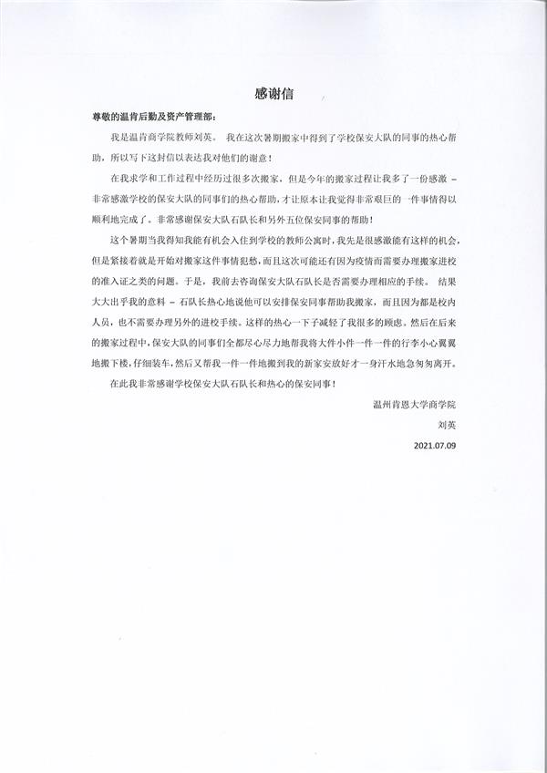 信中写道:“石队长热心地说他可以安排保安同事帮助我搬家,一下子减轻了我很多顾虑。在后来的搬家过程中,保安大队的同事们全都尽心尽力地帮我将大件小件一件一件的行李小心翼翼地搬下楼,仔细装车,然后又帮我一件件地搬到我的新家安放好才一身汗水地急匆匆的离开。”刘英老师在暑期入驻教师公寓,因担心搬家难手续繁杂而愁苦,最终在肯恩大学保安队的热情帮助下顺利搬家。纸短情谊长,刘老师通过这封感谢信,衷心的感谢了肯恩大学保安队的队员们,他们不但在安保工作上尽职尽责,对待校园的每一位师生,更是将热情和服务贯彻始终。