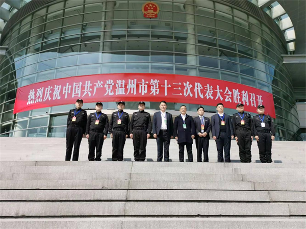 2月24日上午,中国共产党温州市第十三次代表大会在市人民大会堂隆重开幕。本次大会的主题是:高举习近平新时代中国特色社会主义思想伟大旗帜,按照忠实践行“八八战略”、奋力打造“重要窗口”、高质量发展建设共同富裕示范区的要求,踔厉奋发、笃行不怠,奋力续写温州创新史、走好共富路,为争创社会主义现代化先行市而努力奋斗。 初春的温州生机勃勃、奋发向上。市人民大会堂内气氛庄重热烈。主席台上方悬挂的金色党徽熠熠生辉。为保证本次会议顺利召开。会议期间,温州市保安服务总公司市府直属保安大队严格按照有关指示要求,结合工作实际,定岗定人、提前部署、多措并举,全力落实各项安保工作和疫情防控工作。
