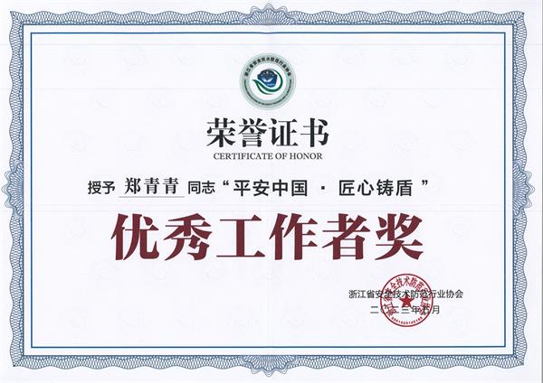 同时,郑青青同志被授予浙江安防“平安中国·匠心铸盾”优秀工作者荣誉称号。郑青青表示十分感谢安防领导对她工作的肯定,在今后的工作中,必将对标更高的标准和更大的责任,本着诚信、规范运作的理念,直面不断升级的困难,接受不断更新的挑战,在协会领导的支持带领下,全力以赴为这一荣誉增光添彩。
