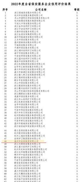 | 喜报!温州安保集团荣获2022年度全省保安服务企业信用评价A级 | |||