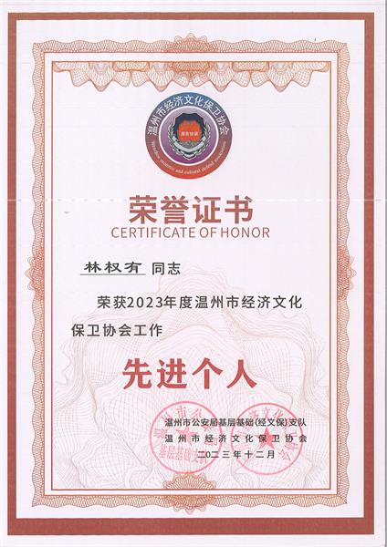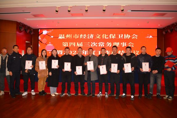 12月22日,温州市经济文化保卫协会召开了开第四届三次常务理事会暨 2023年度工作总结会议,会上,协会表彰了2023年协会工作先进集体和先进个人,其中,e77乐彩荣获温州市经文保协会“先进集体”称号,副总经理林权有荣获协会工作“先进个人”称号!