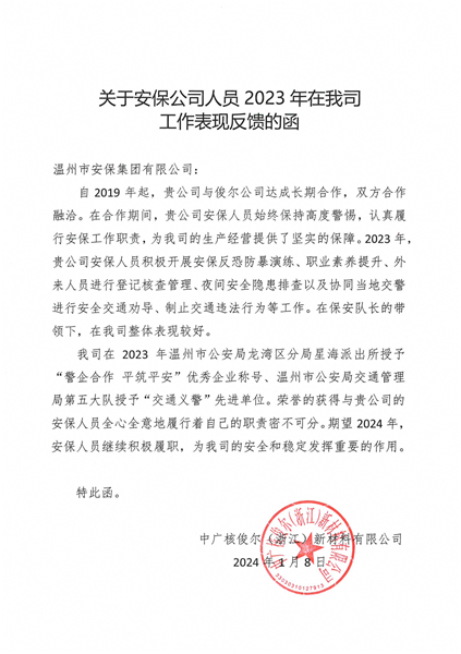 | 纸短情长,砥砺奋进——温州市安保集团驻中广核俊尔新材料有限公司保安队收到表扬函 | |||