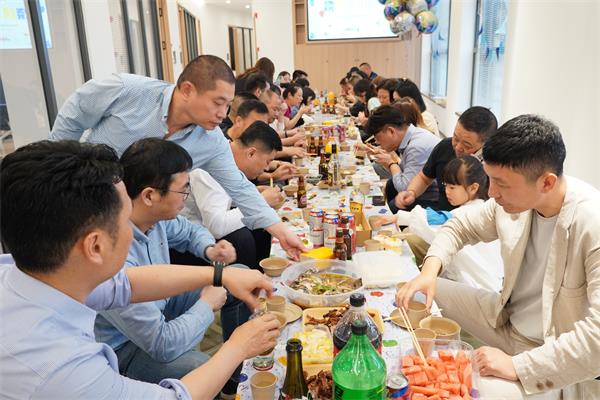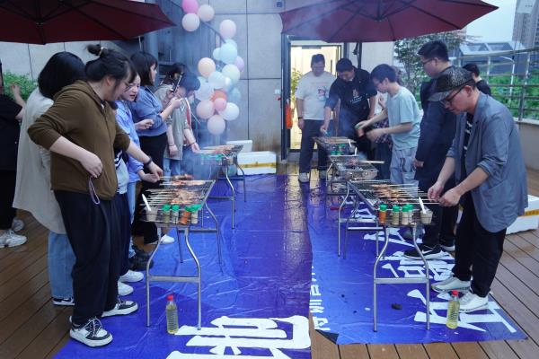 活动开始前,同事们便利用休息时间“拖家带口”开始布置场地,大家主动分工、协作开干,有的将瓜果零食装盘,有的吹了气球到处绑,有的铺开桌椅桌布,有的准备食材……一番不亦乐乎的忙碌后,大家就等着傍晚食材出炉开吃啦。 傍晚五点半,大家准时到达烧烤地点,此时下起了淋淋漓漓的小雨,大家热情不减,把椅子搬进室内,摆上餐具饭菜,开始烧烤。热气腾腾的烧烤不仅满足了大家的胃,更温暖了大家的心,大家围坐在一起,一边享受自己烤制的美食,一边聊着生活和工作中的趣事,享受难忘的团建时光,欢声笑语随着缕缕炊烟萦绕在空中,一片其乐融融。