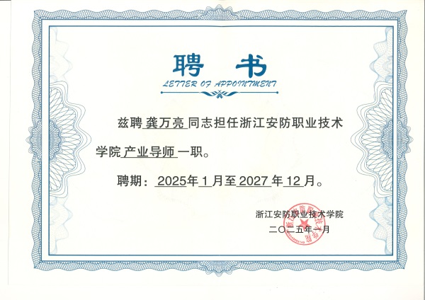 浙江安防职业技术学院聘请龚万亮同志担任学院产业导师一职。