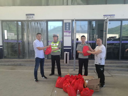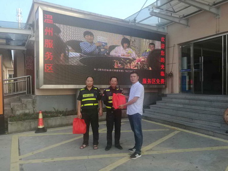 8月3日上午,公司一大队李国君大队长等一行向奋战在“高温模式”下的一线队员送去了神丹、十滴水等防暑降温物品,并捎上了公司领导深切的慰问。 慰问走访中,一大队分别来到温州南服务区、高速交警卡点大队、甬台温浙闵收费所等各执勤点,由于温州南服务区和甬台温浙闵收费所该两执勤点保安员都需在户外执勤,眼下正值高温酷暑天,要一直在无遮无挡的烈日下协助交警指挥车辆、行人的通行,饱受着烈日的煎熬,他们依然坚守岗位,为保市民交通安全而默默奉献着。李大队长对全体队员这种艰苦奋战、无私奉献的精神给予了高度评价和万分感谢。同时要求各执勤点队员要做好防暑降温措施,避免高温中暑事件发生,也希望各队员要继续发扬不怕苦不怕累的工作作风,再接再厉,全力以赴做好客户单位交办的各项安保任务。 |