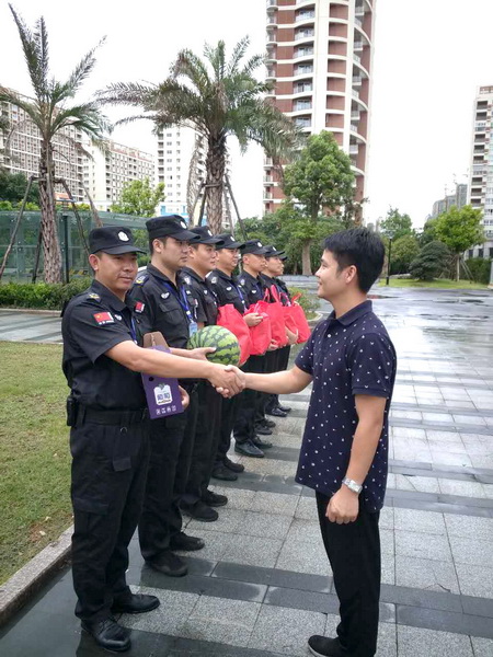 虽然立秋已经过了半个多月,但是“秋老虎”威力不容小觑,午后的阳光依旧猛烈,气温最高的时候依然达到了38℃,奋斗在每个岗位上的保安员用自己的行动和汗水认真履行着自己的职责。 为进一步做好防暑降温工作,确保一线队员保质保量完成各项安保任务,8月29日上午,总公司二大队郭君大队长携带西瓜、清凉降暑饮料和夏令用品走访慰问一线保安员,恰似夏日里的凉风送到队员们的心坎上。 郭君大队长首先为高温天气仍战斗在一线的队员们表达了感谢,同时叮嘱大家要增强防暑降温意识,注意身体。 近半天的走访慰问给战斗在酷暑中的一线队员带来了一丝丝凉意,鼓舞了士气,激发了大家奋发工作的热情。队员们都表示要继续发扬战高温、抗酷暑的奋斗精神,立足本岗,确保完成公司的任务,站好每一班岗。 |