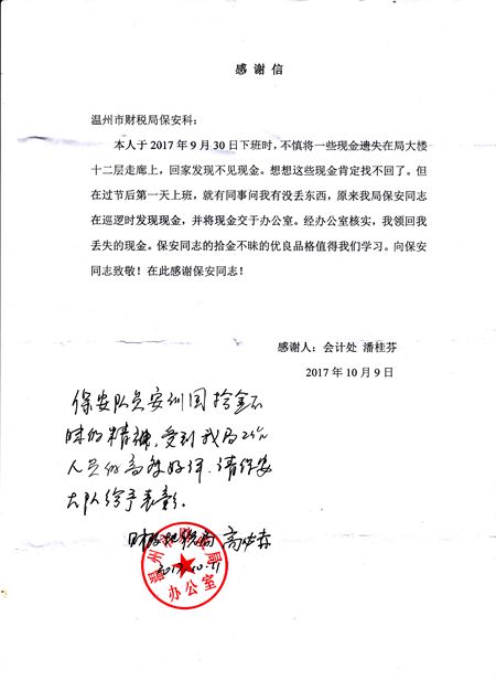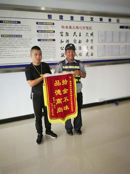 十月份以来,在十九大胜利召开的大好形势下,温州市保安服务总公司精神文明建设喜讯频传。温州市保安服务总公司好人好事、拾金不昧层出不穷,良好的道德风尚蔚然成风,充分体现了温州市保安服务总公司优质的服务和良好的职业道德风尚。 最美保安员黄磊 今年35岁的黄磊是市府直属大队东北片区的保安,负责市住建委办证大厅巡查工作。 2017年10月13日下午五点左右,住建委办事大厅来往办事人员络绎不绝,黄磊像往常一样在大厅巡查,当他巡至42号窗口附近时,发现最后一排等候区椅靠座位上有个黑色男士布包,而周围不见主人寻找。在旁等待了7、8分钟,还是无人来寻,黄磊马上将情况汇报给李训帮班长,收到班长指示将遗失物放置监控室暂时保管。出于安全起见,李训帮班长查看包裹内物品,发现内装现金12. 8万元,银行卡12张及钱包等贵重物品。保安队将情况立即上报大队部。过了5分钟左右,有名男子带着两名老人四处查看寻找并询问人员,有无看到一个提包。经队员核实后,李训帮将钱款交还给该男子一家。 据了解失主名叫朱鹏飞,当天下午他带他父母来办事大厅办理房产过户手续,同行有3人,但都围在办事窗口,将手提包遗忘在座位上,而这笔钱是给父亲看病用的,要是丢失真不知如何是好。朱先生寻回钱后非常感动,深感幸运,赞叹保安有如此拾金不昧的精神难得可贵,并赠送锦旗以表谢意。 拾金不昧胡胜利 2017年10月16日中午,温州市保安服务总公司车管所保安队队员胡胜利在综合大楼办事厅内例行巡逻时,突然在大厅座椅上看到一个男式黑色皮包,在环顾四周确认皮包被主人遗失后,胡胜利拿起皮包,发现包内有现金一万四千元和个人证件。胡胜利马上把皮包交给科室民警暂时保管,等待失主认领。 民警根据皮包内证件信息联系到失主游先生。游先生连忙赶到办事大厅认领失物,在确认过身份后,拿着失而复得的皮包,游先生握着胡胜利的手连声感谢,并对车管所保安员拾金不昧的精神称赞不已。事后,失主还特意送来锦旗表示感谢。 急人所及安训国 9月30日下午,温州市保安服务总公司驻温州市财政局保安员安训国在大楼内巡逻时捡到现金若干元。由于第二天恰逢国庆假期,大楼内工作人员已经全部回家,安训国只能将钱交到财政局办公室等待失主节后认领。 长假过后,经过财政局办公室的一番寻找,终于找到失主。失主潘女士在钱丢失后原以为找不到了,但是得知钱被保安员安训国捡到并上交后十分惊喜。领到失而复得的现金后,潘女士带着一封感谢信到保安队感谢安训国,安训国拾金不昧的精神也得到了财政局的高度好评,受到了公司的表彰。 拾金不昧是我们中华民族的传统美德,更是一个人高尚道德情操的体现,队员们以实际行动践行了这种可贵精神,不仅展现了优秀的职业素养,更是彰显了崇高的道德风尚,为公司全员树立了良好的榜样。