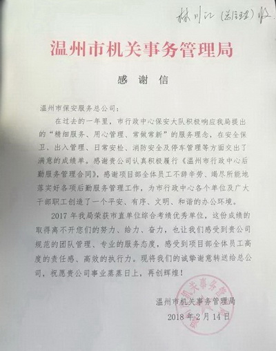 2月14日,温州市机关事务管理局给总公司一封《感谢信》,感谢总公司规范的管理团队、专业的服务态度、高度的责任感和高效的执行力对市行政中心安保工作的付出与努力。 自2003年至今,总公司一直服务于市行政中心保安服务项目,在15年的安保服务实践中,总公司以全心全意为用户服务为宗旨,为市行政中心提供全面、专业、规范、优质、高效的安保服务,同时总公司摸索出了一套符合市行政中心实际情况的安保后勤服务保障体系。 总公司本着“安全至上,预防为主”的方针,从日常的人员来访管理、消防安全管理、治安巡逻管理、物资放行管理到突发事件的处理、群体性群众信访处理等各方面均形成相应操作流程与体系,从而有力地保障了市行政中心正常工作秩序。 15年来总公司在市机关事务管理局的指导和帮助下与入驻各单位建立了顺畅的沟通渠道,构建了完善的服务模式,得到了市机关事务管理局及入驻单位的普遍认可。 经过15年的服务经验总结与应用,总公司对市行政中心的管理服务理解更加深入,在过程中不断总结经验,并不断进行完善及沉淀。 2017年总公司驻市行政保安大队为市行政中心提供优质的安保服务,得到了市机关事务管理局的一致好评,今后总公司在林川江总经理的带领下全力以赴做好各项安保工作,为确保市行政中心安全再创佳绩。